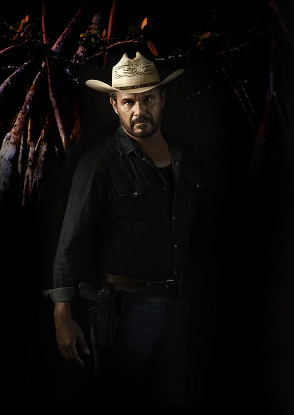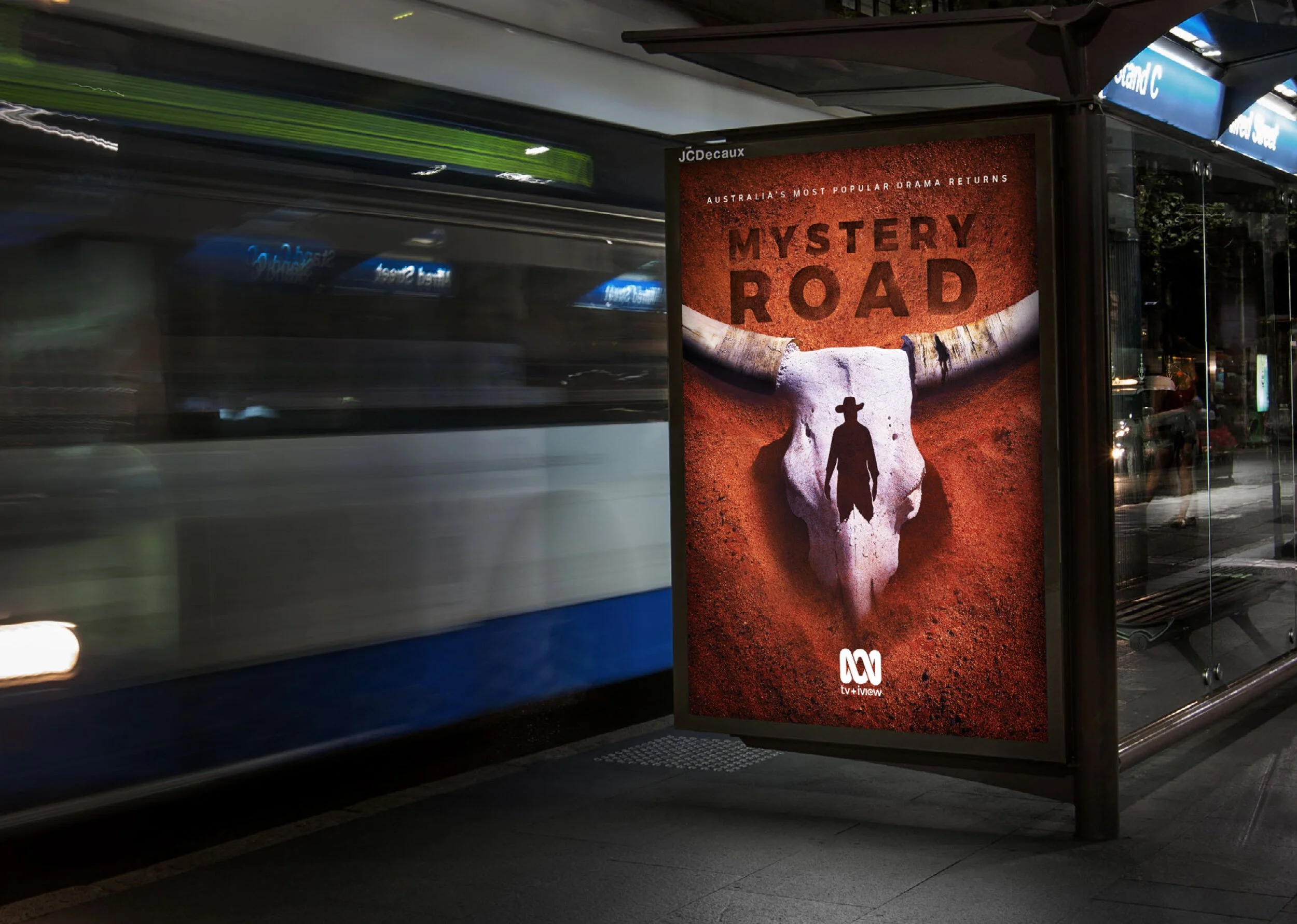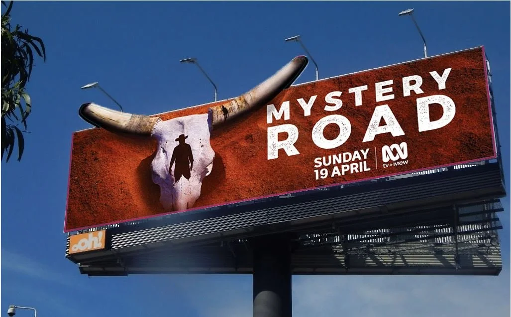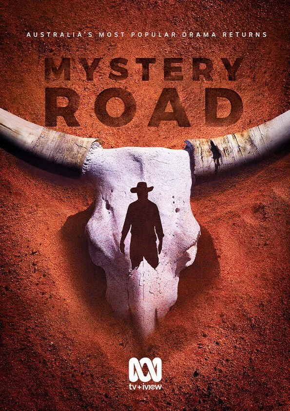 A MODERN INDIGENOUS WESTERN, THE KEY ART SHOWED AN IMAGE OF A BULL’S HEAD EMERGING FROM THE RED AUSTRALIAN DIRT, CARVED WITH THE SILHOUETTE OF DETECTIVE JAY SWAN. THIS WAS A NOD TO THE WESTERN AUSTRALIAN LOCATION AND THE APPEARANCE IN THE DRAMA OF A HEADLESS BODY.